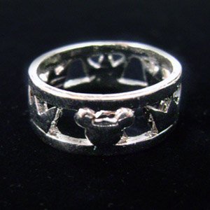 This is a silver-colored ring, from the popular game series Kingdom Hearts!This ring features a band of Sora Crowns and a Mickey head in the center! The ring itself is a silver color. The ring is approximately size 7 to 9.5. Its a great way to show you're a Kingdom Hearts fan everyday of the week!
